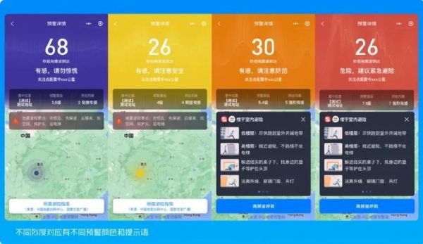 出现不同烈度的地震时,提醒方式有所不同,会有对应不同的预警颜色和提示语。