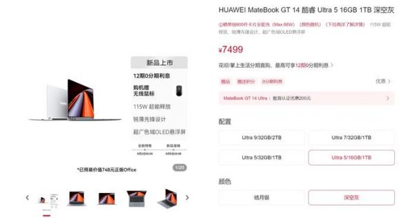图源:华为作为MateBook GT系列的首款产品,MateBook GT 14的定价并不低。目前官网显示有三个不同的版本,分别搭载英特尔酷睿Ultra 5/7/9处理器,起售价分别是:Ultra 5版本7499元,Ultra 7版本9199元,Ultra 9版本10999元。其中Ultra 7及以上版本仅提供32GB运存的选项,且Ultra 9版仅有32GB+2TB一个配置可选。