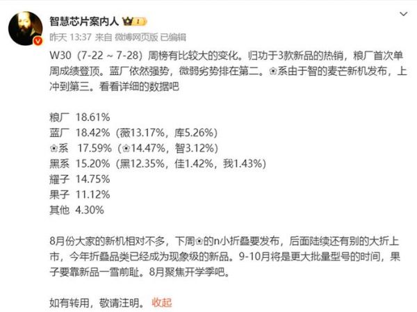总而言之,W30周榜的变化充分展示了中国大陆手机市场的激烈竞争和不断变化的格局,或许在下一周,这个排名又要发生改变了。