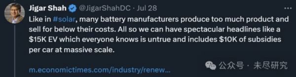 他还指出,就像在太阳能领域一样,中国补贴其生产商以低于成本的价格生产电池和电动汽车,这使得其他国家的公司很难留在这些市场中: