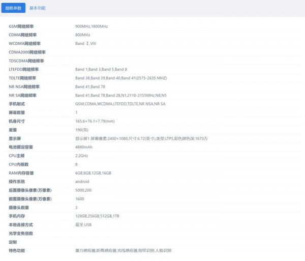 电信设备终端网显示,这款新机的机身尺寸为165.6×76.1×7.79mm,机身重190克;正面配备了一块6.72英寸屏幕,分辨率为2400×1080;搭载了CPU主频为2.2GHz的8核处理器,提供6GB/8GB/12GB/16GB内存以及128GB/256GB/512GB/1TB机身存储;前置1600万像素摄像头,后置5000万像素主摄和200万像素镜头组合;内置额定容量4880mAh电池。