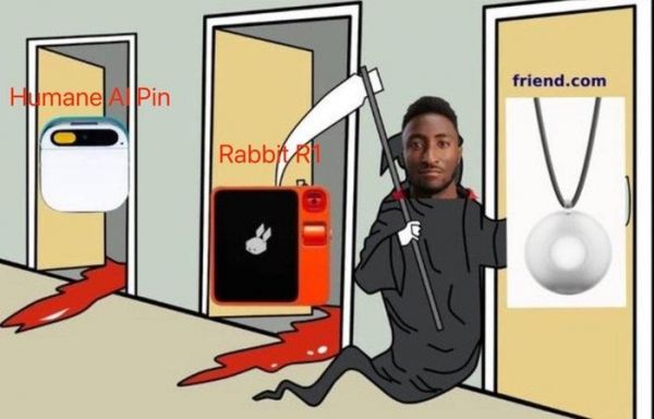 在Marques要做测评的帖子下,网友们甚至还做出了下面的梗图。Marques化身“死神”,或许要上演AI产品的“帽子戏法”。