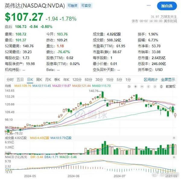 然而好戏还在后头,8月1日和2日英伟达连续两天分别下跌6.67%和1.78%,目前总市值为26400亿美元(18万9299亿人民币)。