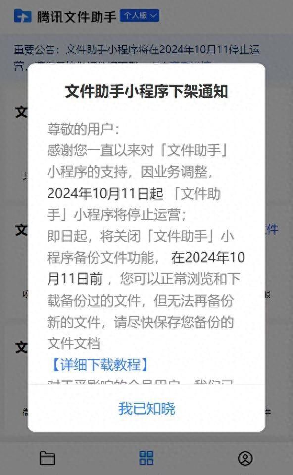 8月5日,根据腾讯文件助手公告,因业务调整,2024年10月11日起“文件助手”微信小程序/web端将停止运营。即日起,将关闭“文件助手”备份文件功能,在10月11日前,用户可以正常浏览和下载备份过的文件,但无法再备份新的文件。公告提到,对于受影响的会员用户,已开放了相应的退款通道。