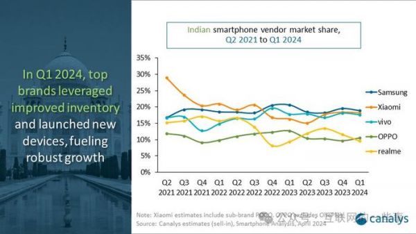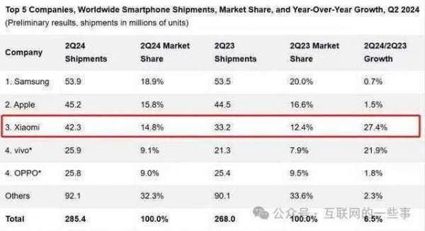 印度市场一直是小米的重要战场。在2024年第二季度,小米不仅保持了第一的位置,还实现了24%的增长,成为五大供应商中增长最快的品牌。