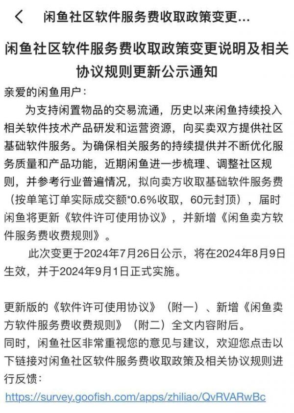 于是,2023年6月,闲鱼宣布对特定商家施行收费政策。今年7月26日,闲鱼进一步发布公告,宣布将在今年9月开始,正式面向全体卖家施行收费。