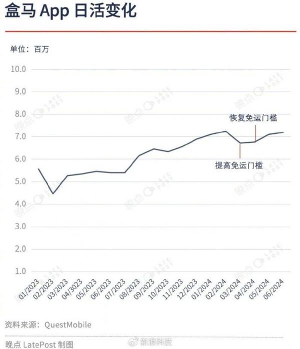 免运门槛提高的同时,盒马应用 3 月日活相较上一个月下滑了 7.2%。严筱磊上任后,立即将免运门槛又降到 49 元,盒马应用的日活又开始缓慢回升。