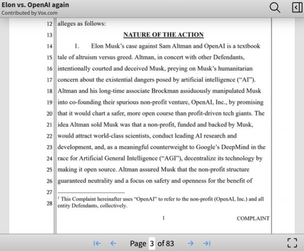 在周一于北加州联邦法院提起的新诉讼中,马斯克称Altman 和 Brockman“刻意利用操纵马斯克共同创立他们的虚假非营利企业”,承诺 OpenAI 将比以营利为目的的科技巨头更安全、更透明。奥特曼向马斯克兜售,由马斯克资助和支持的非营利组织将吸引世界级的科学家,进行领先的人工智能研究和开发,并在通用人工智能(AGI)的竞赛中与谷歌的DeepMind抗衡,通过开源来分散其技术。OpenAI 的这一非营利保证是“奥特曼长期欺骗的诱饵”。