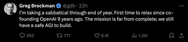 可就在昨天,格雷格·布罗克曼(Greg Brockman)也宣布长期休假,一直休到年底。