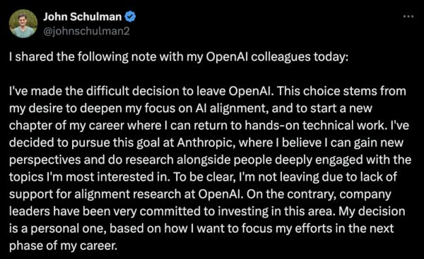 OpenAI联合创始人约翰·舒尔曼(John Schulman)在X上发长文官宣了一个“艰难决定”——离开 OpenAI ,前往Anthropic(即Claude团队,OpenAI的主要竞争对手)。