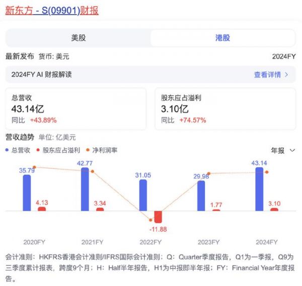 新东方2024财年财报显示,公司营收近310亿元人民币,同比增长44%。从营收规模上看,已经达到过去5年的最高点,已经赶超2021年。