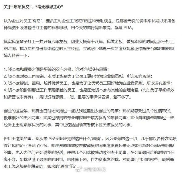在谈及关于“毫无感恩之心”提到,“创业的这些年,我真金白银地支持过一些从我这里出去创业的同事”“但对于这类的事,我从来也没无耻地觉得这是什么‘恩情’”。此外,罗永浩还表示因为忙新的创业,除了公司必要的辟谣声明,和偶尔帮朋友做点儿转发,已经在网上两年左右没怎么发过声了。