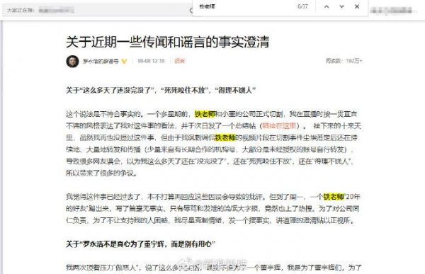 【#罗永浩长文37次提及铁老师# 此前发通知下架铁公鸡片段】#罗永浩称真金白银帮员工创业# 8月8日,@罗永浩的辟谣号 发5000字长文回应近日被炮轰,文稿中回应了“这么多天了还没完没了”“这么多年了,老罗一没事干就骂铁老师”等问题。值得注意的是,文章中,37次提及“铁老师”,而在不久前网传图片显示交个朋友公司向其授权切片账号通知,“铁老师”“铁公鸡”“俞敏洪”这些词都不可以使用。#罗永浩回应被指五宗罪#