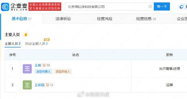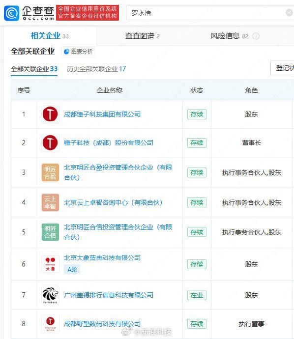 企查查APP显示,罗永浩当前共计关联33家企业,而其新创业细红线公司,即北京细红线科技有限公司由其合作伙伴王威担任法定代表人、执行董事、经理职务。