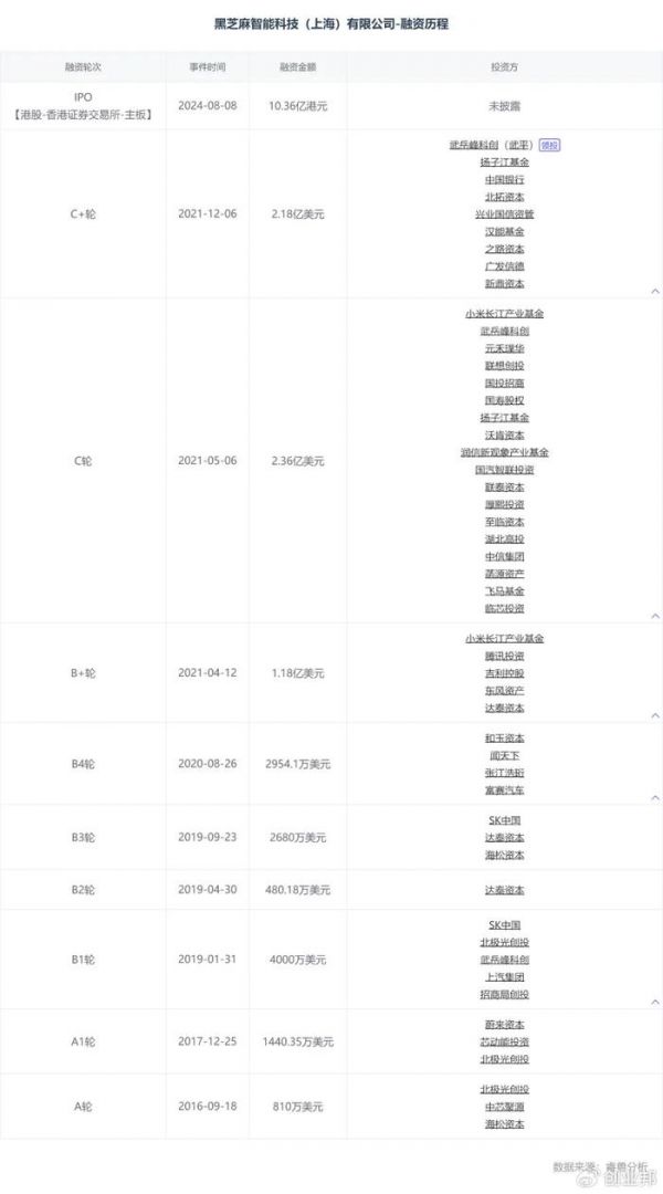 睿兽分析显示,IPO前,黑芝麻智能共融资9轮,获得了包括北极光创投、海松资本、上汽集团、蔚来资本、小米长江产业基金、腾讯、吉利控股、武岳峰科创等众多投资机构的投资,堪称阵容豪华,累计融资6.95亿美元(约合49.74亿元人民币)。