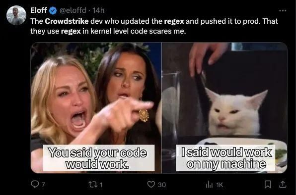 但其实,真正让网友们感到气愤的还是 CrowdStrike 揭示的问题,用网友精辟的总结就是,“根本原因:没有测试。解决方案:下次确保在发布前进行测试。”而且,其披露出来的在内核代码中使用正则表达式的做法也被网友群嘲。