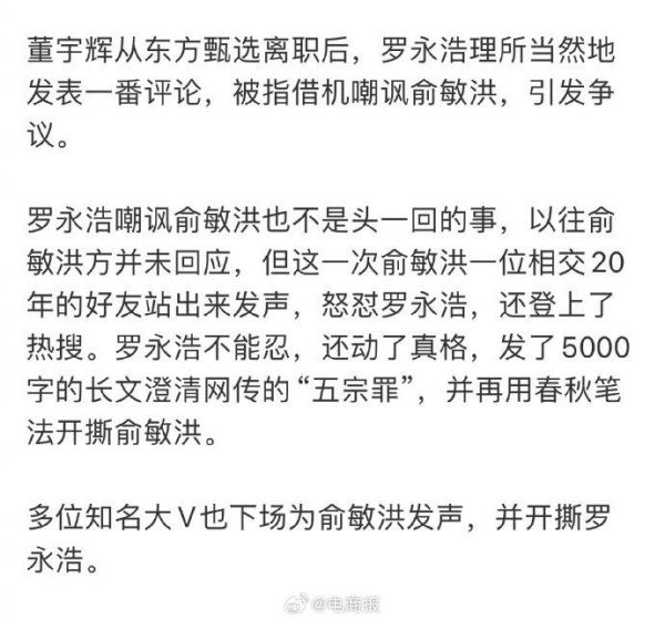 罗永浩5000字澄清文风波升级,知名大V接连下场替俞敏洪发声,罗永浩回应。