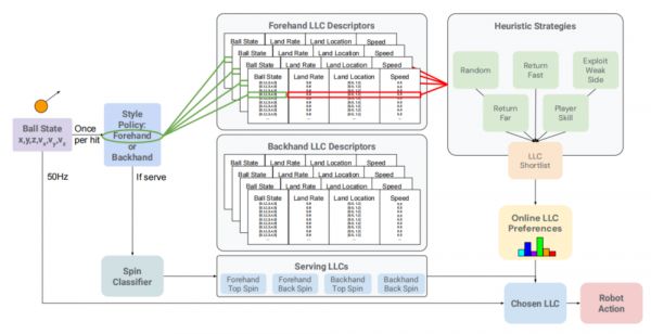 图 | 一旦球被击中,HLC 首先通过对当前球状态应用风格策略来确定正手或反手(本例演示选择正手),从而决定将球返回给哪个 LLC。