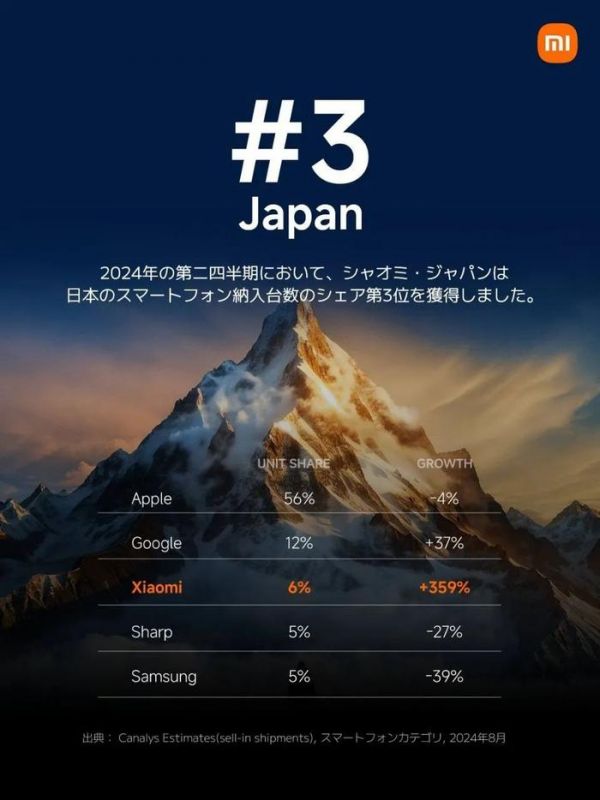 但无论如何,市场报告也验证了小米手机在日本市场的「流行」。小米日本在最近发布的一张宣传海报中,就援引市场研究公司 Canalys 的报告指出,2024 年第二季度,小米手机在日本市场的出货量剧增 359%,份额增至 6%: