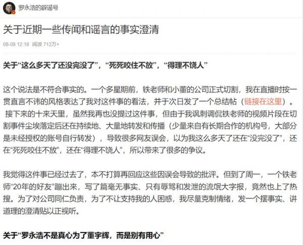 截至发稿前,该长文阅读量已突破712万。