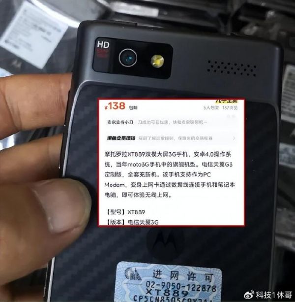 而在近期,闲鱼出现大量自称是全新的摩托罗拉XT889手机,开价138元。XT889既是电信版的Moto RAZR V,此外还有移动版MT887、联通版XT885,2012年发布价为3299元。