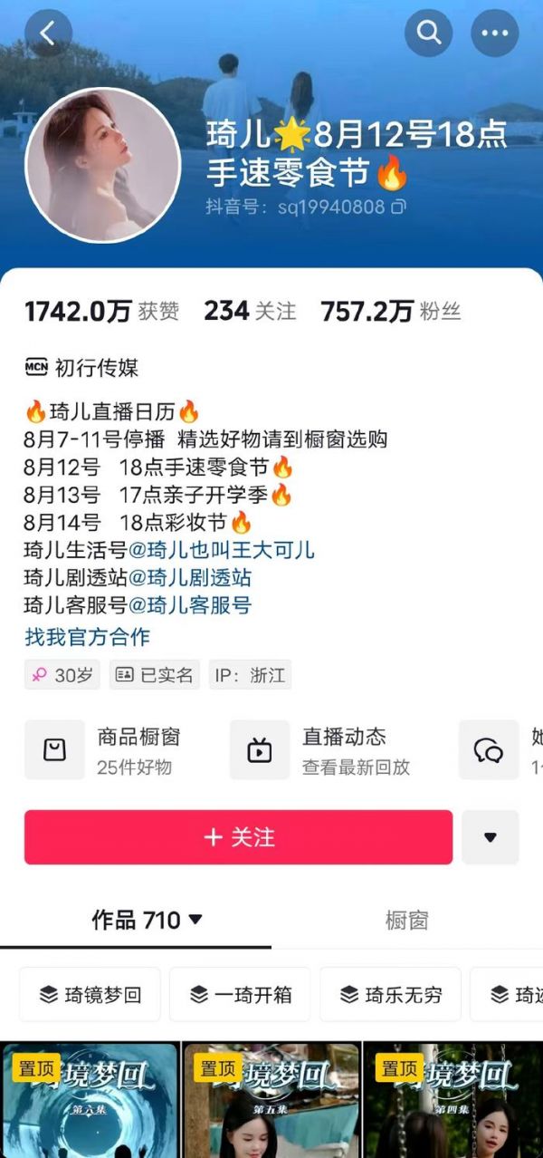 此外,谦寻还将直播间开到了抖音平台,其中琦儿目前拥有750余万粉丝。