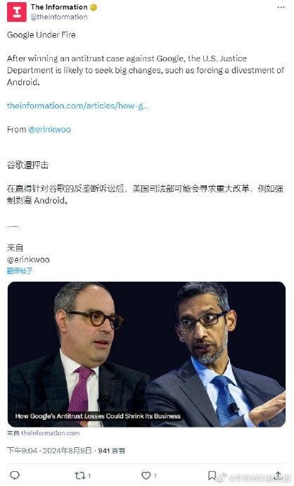 8月9日消息,The Information 称,美国司法部在赢得了针对谷歌的反垄断诉讼后,不仅会削弱该公司与苹果之间的联盟关系,还可能会寻求让该公司实施重大变革,比如强制剥离安卓。
