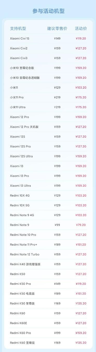 8折手机后盖换新服务覆盖12款机型,活动价68元起。