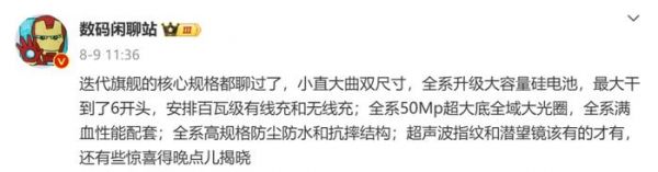 博主@数码闲聊站 近日的一份爆料中提到:“迭代旗舰的核心规格都聊过了,小直大曲双尺寸,全系升级大容量硅电池,最大干到了6开头,安排百瓦级有线充和无线充;全系50Mp超大底全域大光圈,全系满血性能配套;全系高规格防尘防水和抗摔结构;超声波指纹和潜望镜该有的才有,还有些惊喜得晚点儿揭晓”。
