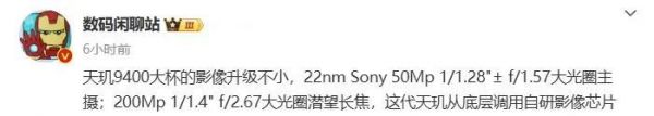 博主@数码闲聊站 今日的爆料中提到:“天玑9400大杯的影像升级不小,22nm Sony 50Mp 1/1.28"± f/1.57大光圈主摄;200Mp 1/1.4" f/2.67大光圈潜望长焦,这代天玑从底层调用自研影像芯片”。