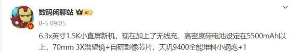 而vivo X200小屏版的屏幕尺寸为6.3x英寸,具备1.5K分辨率,采用直屏方案,内置容量5500mAh以上的电池,支持无线充,配备70mm 3X潜望式长焦镜头,号称“全能堆料小钢炮”。
