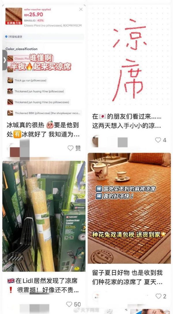 “连续高温又不下雨,公寓又是落地窗,被太阳晒得感觉自己身处蒸笼,赶紧在亚马逊下单了凉席,感谢凉席救我一命。”一位英国留学生momo在小红书晒自己的经历。