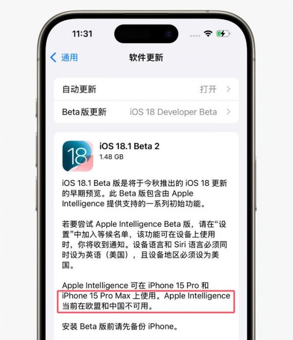 言外之意就是,国行版本的iPhone 15 Pro系列用户别白费力气了,即便是升级了iOS 18.1测试版也无法体验Apple Intelligence及提供的相关AI功能。