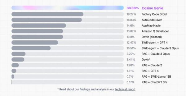 本周,一家 Y Combinator 支持,名为 Cosine 的创业公司宣布推出自己的全新自主 AI 工程师 Genie。该公司表示,Genie 的表现轻松超越了 Devin,在第三方基准测试 SWE-Bench 上的得分为 30%,而 Devin 的得分仅为 13.8%。