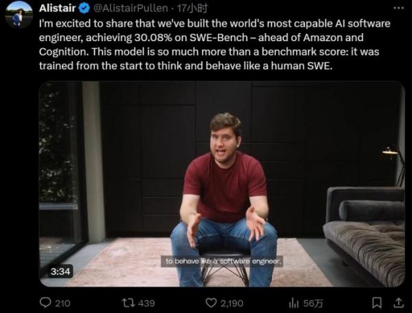「这个模型远不止是一个基准跑分而已:它是以像人类 SWE(软件工程师)一样思考和行动为目标从头开始训练的,」Cosine 的联合创始人兼首席执行官 Alistair Pullen 表示。