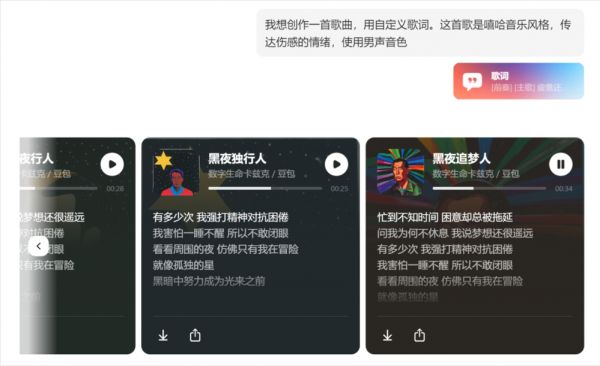 很快啊,20秒左右,豆包三首歌就给你生成出来了。