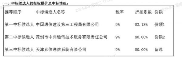 经过评标,共有3家投标人成为中标候选人,其中,中国通信建设第三工程局有限公司以83.18%的折扣系数位列第一中标候选人,拿下份额1;深圳市中兴通讯技术服务有限责任公司以80%的折扣系数位列第二中标候选人,拿下份额2。排在第三位的天津京信通信同样给出了80%的折扣系数,但遗憾落标。