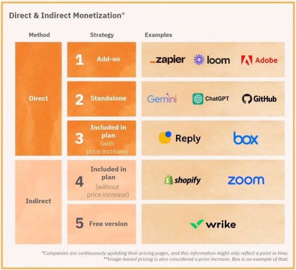 根据研究,大多数公司都采用直接变现。要么将新的人工智能功能/产品作为附加功能提供,要么将其捆绑在现有计划中并提高价格(或基于使用量的组件)。
