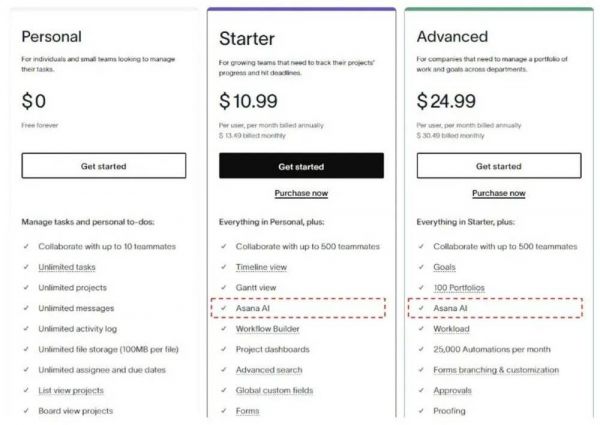 上面是Asana的定价方案,它将AI功能添加到现有计划,这种方法最适合以下情况:
