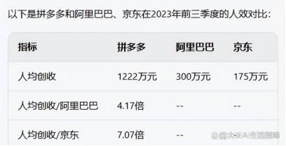 结合财报和公开数据,拼多多的人效是阿里巴巴的4倍多,更是京东的7倍以上。