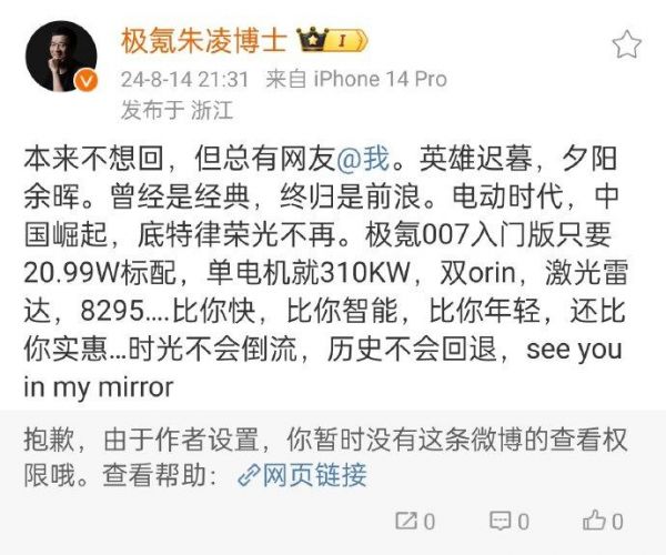 极氪科技副总裁的回应也很到位:英雄迟暮,夕阳余晖。曾经是经典,终归是前浪。[吃瓜]