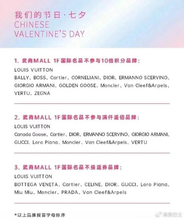 但LV很快就官宣它不会参加相关活动,随后一张武商Mall公告图片流出,上面不凑这个热闹的还包括了梵克雅宝、迪奥、Gucci、Prada、Miu Miu 等近20个品牌。