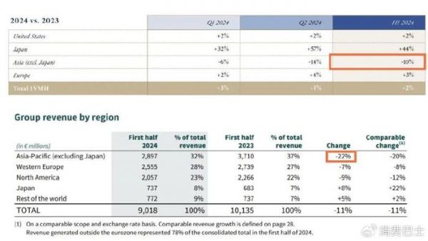 它当然也碰上了奢侈品行业在中国的大滑坡。今年上半年,LVMH在非日本以外的亚洲地区收入下滑了10%、开云集团下滑20%,就算是保住了增长的爱马仕,中国区也成了它增长最慢的区域。