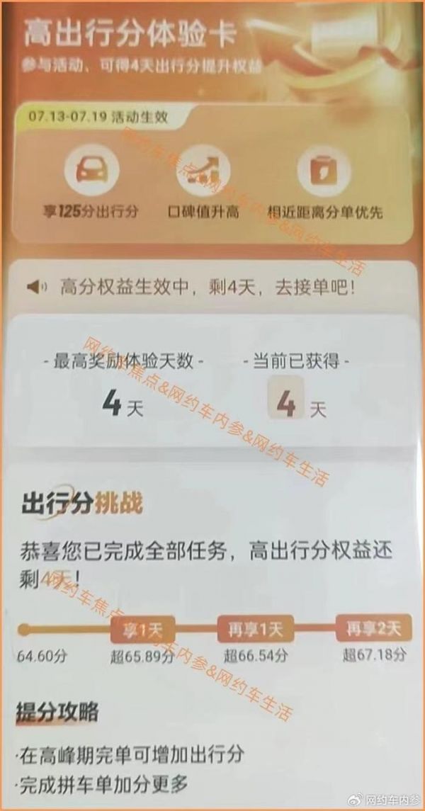 还有师傅可能会说,出行分低的就永远低,只靠高峰期出车哪里补得上。事实上,从今年6月份开始,滴滴针对出行分低的司机群体也发放了高出行分体验卡,司机师傅收到活动通知后,完成活动页面的加分任务,就会获得125分的高出行分体验,体验天数1-10天不等。7月份,上海、昆明、常州的很多滴滴师傅都向《网约车内参》表示,收到了高出行分体验卡通知后,完成相应的单量后,出行分直接变成了125分。