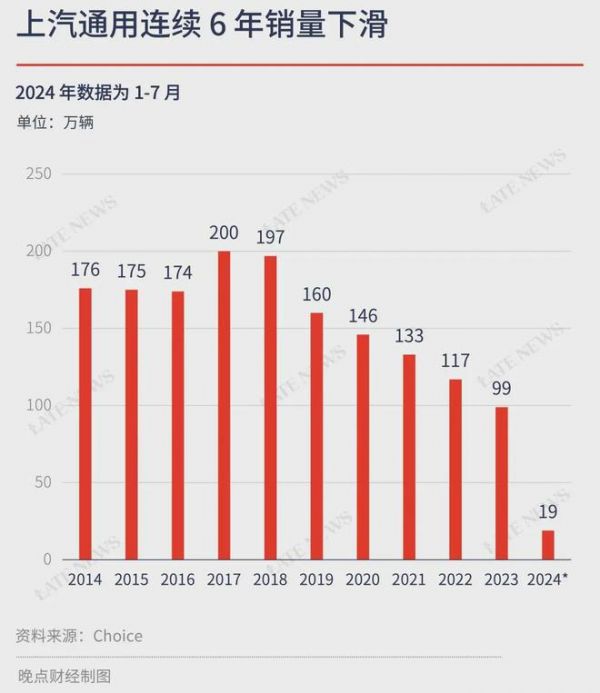 今年不出意外会是上汽通用在华销量连续第 7 年下滑。业绩高点是 2017 年的销量突破 200 万辆。低点是去年的 87 万辆(财报口径)。止不住的颓势在 2024 年加速,前 7 个月累计批发销量仅 24 万辆,同比下滑 55%。这意味着今年剩下的 5 个月要卖 63 万辆才能赶上去年。