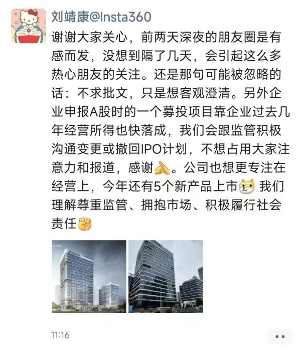 刘靖康解释道,前些天朋友圈是有感而发。公司会跟监管积极沟通变更或撤回IPO计划,企业申报A股时的一个募投项目靠企业过去几年经营所得也快落成。
