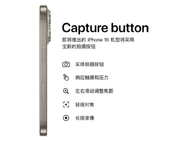 关于这颗新按钮,最近有了更全面的细节爆料。据外媒报道,苹果称iPhone 16这颗新按钮为“Capture Button(拍摄按钮)”,这颗按钮不仅支持各类手势操作,还能感知按压力度。