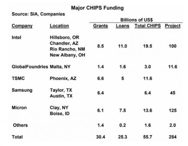 这些补贴颁已经发给14家公司,但五家晶圆厂(英特尔、格芯、台积电、三星、美光)占据了绝大部分资金,而且他们也获得了州和地方的补贴。当然,钱还没发完,美国商务部计划在2024年底前,分配完《芯片法案》的所有390亿美元直接激励拨款。