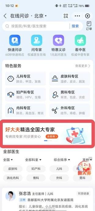 目前,打开支付宝首页的医疗健康频道,选择在线问诊后,能看到好大夫的字样,点击进入后所呈现的内容和好大夫在线App里的界面一致。