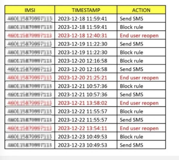 用户一个手机号于2023年12月18日、20日、21日和22日熔断后,多次自主恢复数据漫游功能。就如何提醒用户做好国际漫游所产生的流量费用控制,上海市通信管理局已指导上海信息通信行业,形成了一整套系统做法。